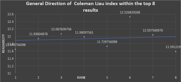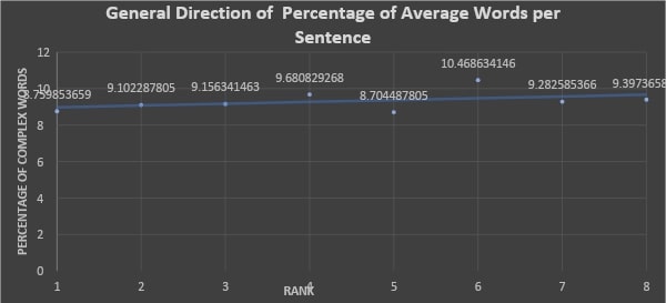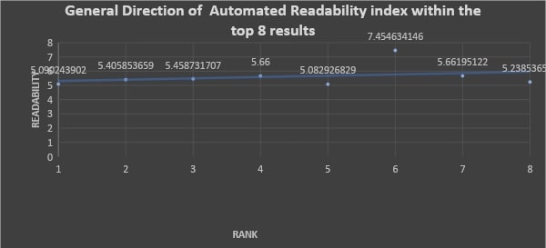 Measures characters per word and sentences per 100 words. Less used in SEO. I found negligible correlation with rank.1 Still, the underlying lesson matched the rest: shorter words, sane sentence lengths.