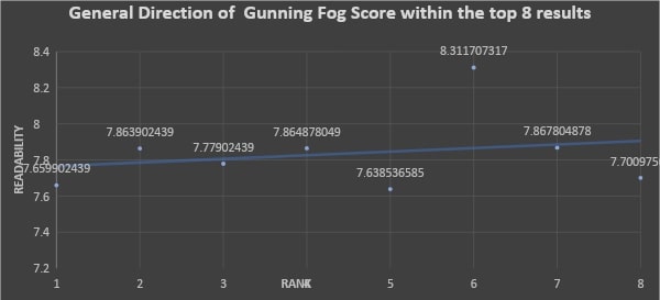 But in my study, Fog correlated the strongest with higher rankings (interpreted as “easier text ≈ better rank”), clustering around ~7.8 (≈ 8th grade).1